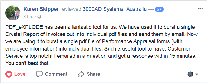 “PDF-eXPLODE is an excellent piece of software. I would certainly recommend it to others on the basis that it does what it is supposed to, is very configurable and the support in the initial set-up and learning curve is second to none. Allowing for the time difference, every e-mail I have sent – and there have been quite few – has always been answered straight away with good sound advice. Other suppliers I have dealt with sometimes take days to respond to a support call.”